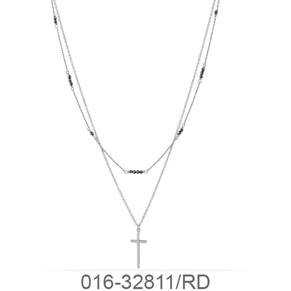 NECKLACE 2 ROW CHAIN 40+5CM.CROSS W/HEMATITE&RHODIUM PLATED